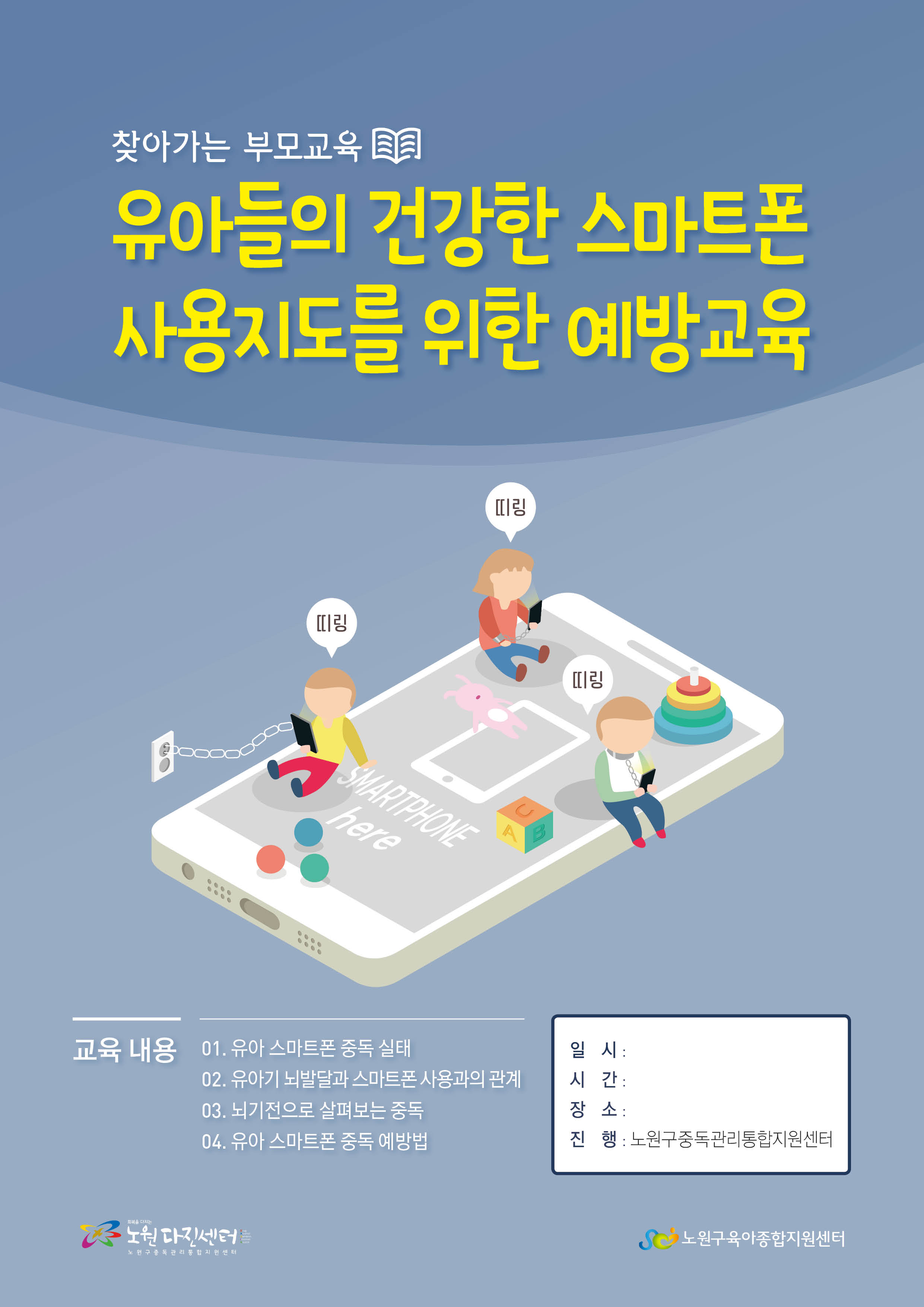 노원구중독관리통합지원센터에서는 영유아의 건강한 스마트폰 지도에 도움을 드리고자 노원구내 어린이집을 대상으로 교육을 진행하고 있습니다.